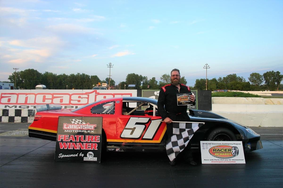 Matt Druar and Eric Brown brought the Super Stocks to the green flag for their main event, with Druar in the lead ahead of Brown, Russ Bulger Jr, Barrett Schenk, and Brian Hallett. Eric Kocher would race his way into the top five as he battled with Jimmy Steffenhagen. Ryan Lagoda spun in turn three to bring out the caution on lap four. Druar would continue to show the way, as Jake Wylie would take over second place on lap nine ahead of Andy Cryan. Druar and Wyle would pull away from the field, until the caution flag that came out on lap 24 as Jeff Whalen and Mike Scott got together in turn four. Druar would continue to show the way ahead of Jake Wylie, Ryan Lagoda, Schenk, and Kocher. Lagoda would battle and pass Wylie to take over second place on lap 28, but the pass wouldn’t last long, as Wylie would regain the runner-up spot on lap 29. Wylie and Lagoda made contact in turn three, with Wylie spinning to bring out the caution. Druar would continue to lead on the restart, as Steffenhagen would battle Schenk for second place. The caution would come out on lap 32, as race leader Druar spun in turn four, locking up the rear end. Steffenhagen and Schenk would battle for the lead, with Schenk taking the lead and would hold off the field to score his first career win at Lancaster. The race was in honor and memory of Grant Brown, who passed away suddenly on Father’s Day.